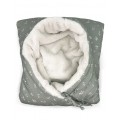 Se cierra mediante los lacitos de lino laterales. La parte inferior del saco se puede abrir con cremallera para que puedas introducir al bebé más cómodamente. Exterior en gasa de algodón orgánico estampada. Interior en tejido polar beige ultra-suave. la base del saco tiene aperturas para que lo puedas colocar en sillitas de grupo 0.