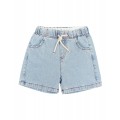 Pantalón corto denim delavado claro. Cinturilla elástica con cordón de algodón crudo para un mejor ajuste. Bolsillos frontales y tipo plastrón en la espalda. Detalles de pespuntes y atacados con hilo a contraste.