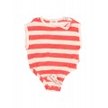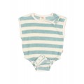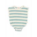 Pelele de rizo suave de algodón orgánico tejido a rayas. Cuello redondo con apertura con botones en los hombros. Manga sisa. Abrochado con botones en la entrepierna para una puesta fácil. Goma elástica en los muslos. Acabados escote y sisa en canalé de algodón crudo.