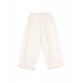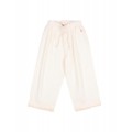 Pantalón largo de algodón orgánico texturado. Detalle puntilla en el bajo. Cintura elástica con cinta interior para mejor ajuste. Bordado a contraste decorativo en el lateral.