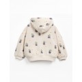 Esta sudadera está confeccionada en punto con una mezcla de algodón regenerativo y algodón reciclado, en color blanco roto. Es un modelo con capucha, bolsillo canguro, elástico en los puños y el bajo, y nuestro estampado de casas.