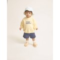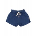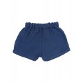 Pantalón corto de muselina de algodón. Cintura elástica con cinta de algodón crudo y botones decorativos de madera. Detalle abertura lateral. Forro cinturilla de tejido a cuadritos.