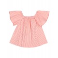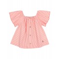 Blusa en seersucker de algodón con estampado a rayas. Escote recto con goma. Mangas anchas con volante con acabado repulgo a contraste. Abotonado frontal con botones de madera. Detalle bordado a contraste en el lateral del bajo.