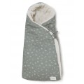 Se cierra mediante los lacitos de lino laterales. La parte inferior del saco se puede abrir con cremallera para que puedas introducir al bebé más cómodamente. Exterior en gasa de algodón orgánico estampada. Interior en tejido polar beige ultra-suave. la base del saco tiene aperturas para que lo puedas colocar en sillitas de grupo 0.