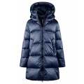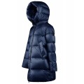 Plumífero largo con capucha, doble cremallera, repelente al agua y abrigada.