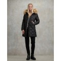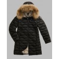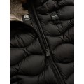 Plumífero largo acolchado con ondas horizontales con capucha fija, perfil en auténtica piel e interior en color contrastante. Prenda femenina con colores fashion y de corte que realza la cintura.