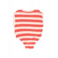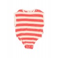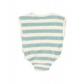 Pelele de rizo suave de algodón orgánico tejido a rayas. Cuello redondo con apertura con botones en los hombros. Manga sisa. Abrochado con botones en la entrepierna para una puesta fácil. Goma elástica en los muslos. Acabados escote y sisa en canalé de algodón crudo.