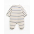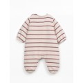 Este pelele está confeccionado en punto con mezcla de algodón regenerativo y algodón reciclado, en color Rosa Oscuro. Es un modelo largo con interior ligeramente afelpado, apertura en el hombro con botón de madera, apertura entre las piernas con corchetes de metal sin níquel, aplicación de elástico en las aberturas de piernas y brazos y un bolsillo en la parte delantera.