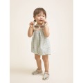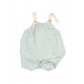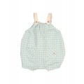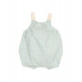 Pelele de cuadro vichy en seersucker de algodón. Cuello redondo. Tirantes de cinta de algodón crudo con botones de madera. Bolsillos tipo plastrón en el frente. Detalle bordado a contraste. Abrochado con botones de presión en la entrepierna para una puesta fácil. Acabados en goma elástica.