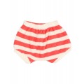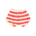 Pantalón corto de rizo suave de algodón orgánico tejido a rayas. Cintura elástica con cordón decorativo. Muslos con goma elástica. Acabados camales en canalé de algodón crudo.