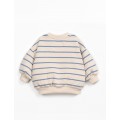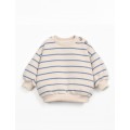 Este jersey está confeccionado en punto con una mezcla de algodón regenerativo y algodón reciclado, en color azul. Es un modelo de manga larga, con cuello redondo, puños y cintura elásticos, apertura en el hombro con botones de coco y estampado de rayas.